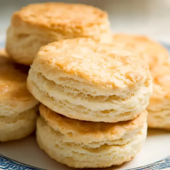 A close-up of fluffy, golden-brown biscuits stacked on a decorative plate.