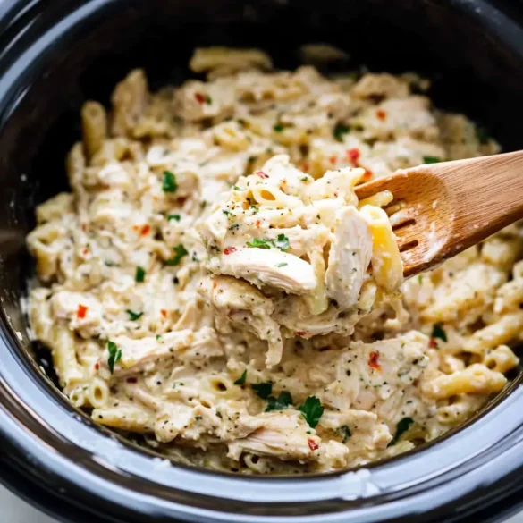 A delightful slow cooker pasta dish that brings together tender chicken, creamy garlic sauce, and perfectly cooked pasta. Ideal for busy families seeking a hassle-free, delicious dinner option.