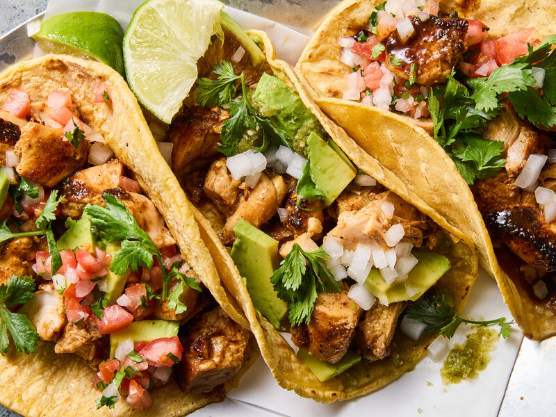 - Assemble tacos: fill tortillas with chicken and desired toppings. Squeeze lime over top.