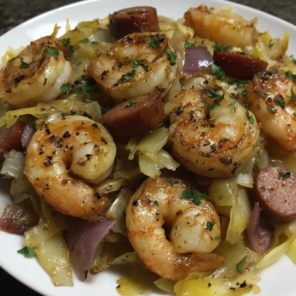 - This one-skillet meal combines the smoky flavors of bacon and sausage with sweet cabbage and savory shrimp for a delicious low-carb dinner option.