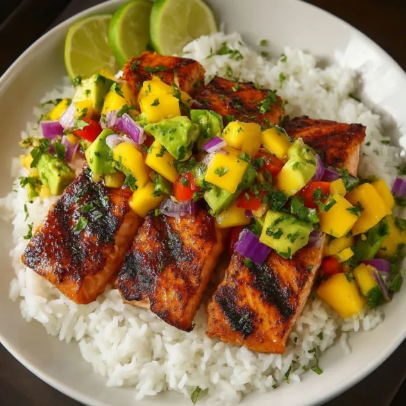 → Can I prepare any parts of this dish ahead of time? Yes, several components can be prepared ahead. The mango-avocado salsa can be made up to 4 hours ahead (add the avocado just before serving to prevent browning). The salmon can be marinated up to 2 hours in advance. The coconut rice can be made earlier in the day and gently reheated with a splash of water or coconut water. For meal prep, keep all components separate and assemble just before serving for the freshest flavor and texture.