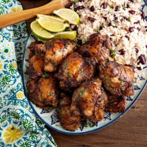 - Serve: Plate the jerk chicken over or beside the rice and peas. Garnish with extra lime wedges and enjoy hot!