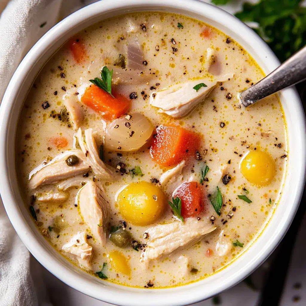 Serve your soup piping hot with crusty bread on the side. The creamy broth and tender bits of turkey make everyone happy. Pure comfort in every spoonful.