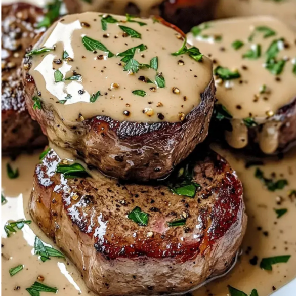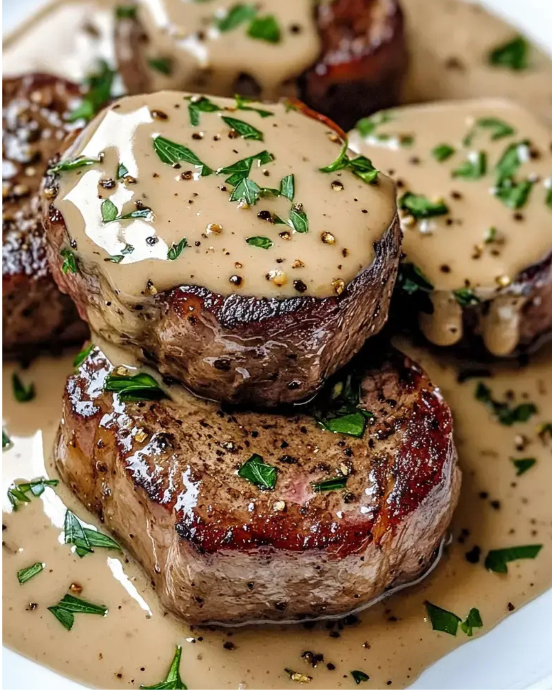 - This Peppercorn Steak with Creamy Sauce is a luxurious dish featuring perfectly seared filet mignon topped with a rich, flavorful sauce.
